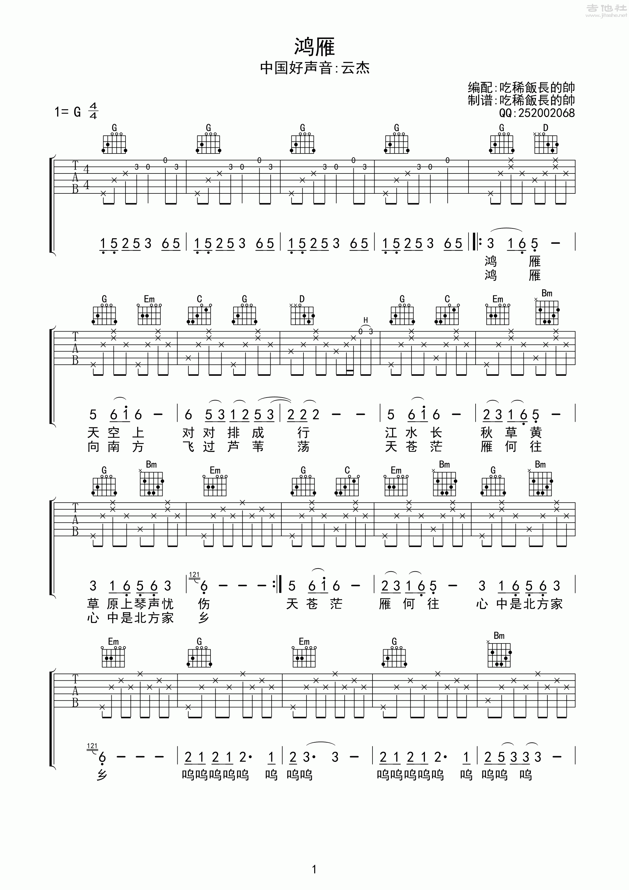 云杰 - 鸿雁 [中国好声音 弹唱] 吉他谱