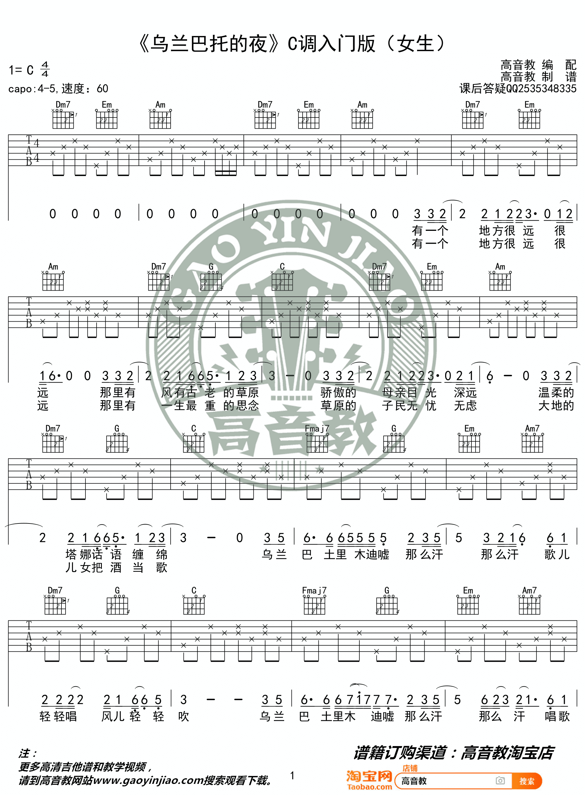 蒋敦豪 - 乌兰巴托的夜( 高音教编配 猴哥吉他教学) [弹唱 C调 入门版] 吉他谱